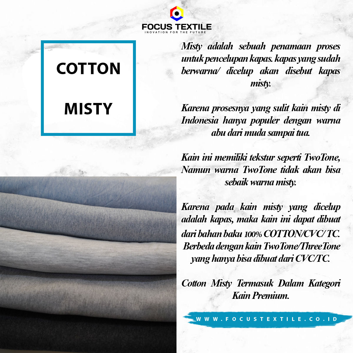 KARENA PADA KAIN MISTY PROSES PENCELUPAN YANG TERJADI IALAH PENCELUPAN SAAT BAHAN BAKU MASIH BERUPA KAPAS, KAIN INI DAPAT DI BUAT DARI BAHAN BAKU 100% COTTON, CVC, DLL.