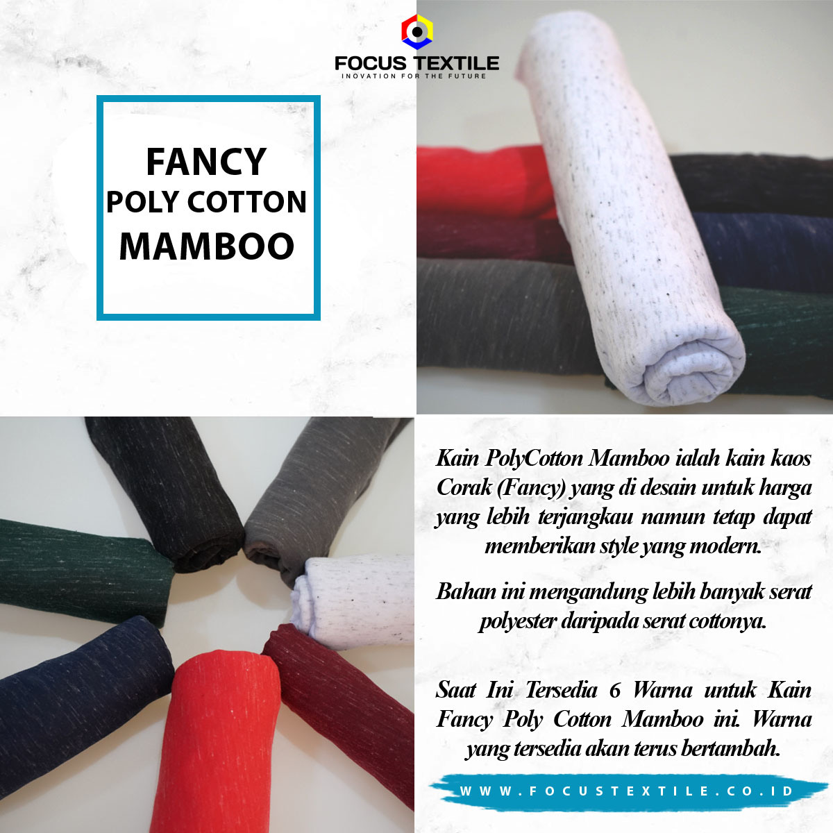 KAIN POLY COTTON MAMBOO IALAH KAIN KAOS CORAK (FANCY) YANG DIDESAIN UNTUK HARGA YANG LEBIH TERJANGKAU, NAMUN TETAP DAPAT MEMBERIKAN STYLE ATAU GAYA YANG MODERN.