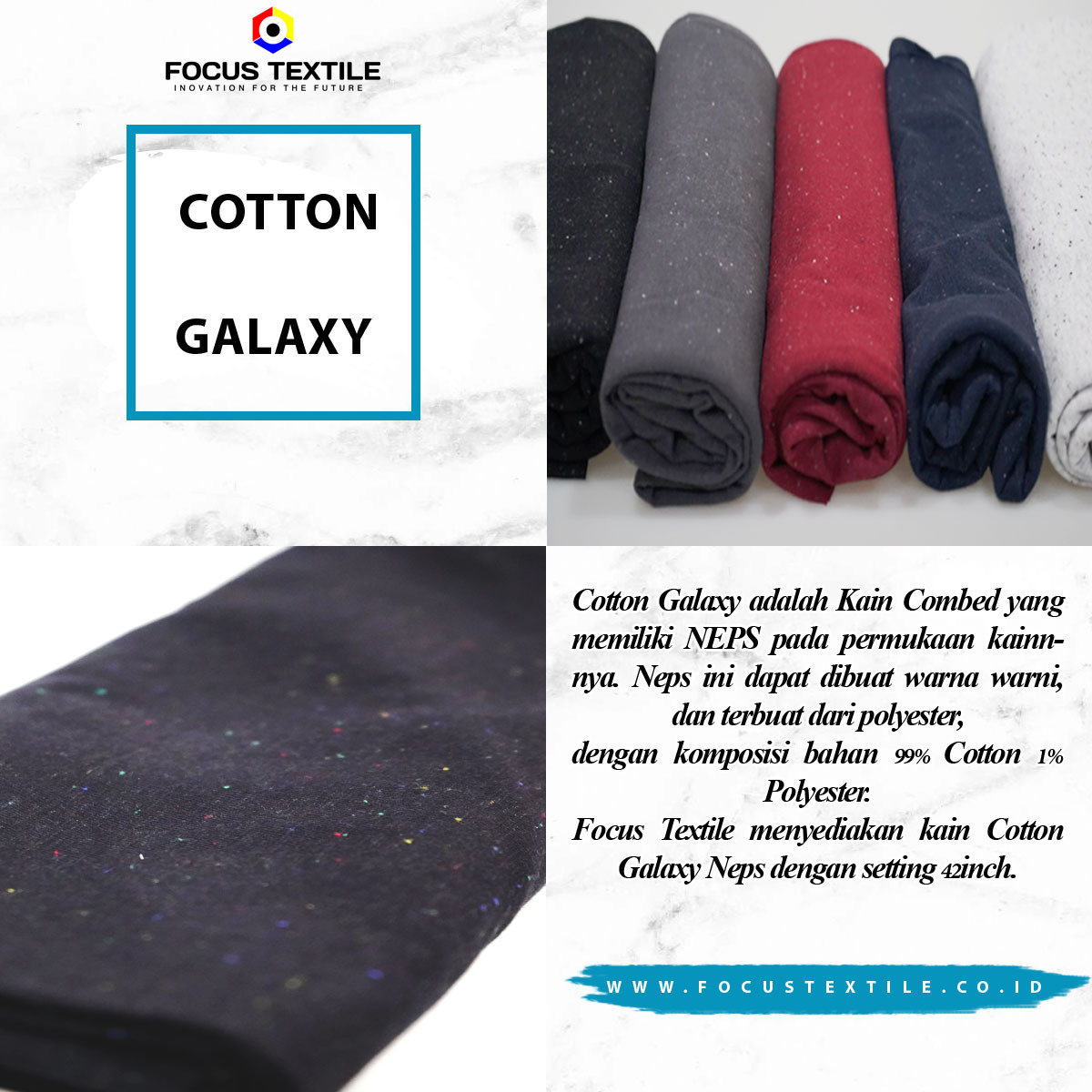 KOMPOSISI BAHAN COTTON GALAXY IALAH 99% COTTON DAN 1% POLYESTER. NAPS YANG BERADA DI KAIN BERASAL DARI SERBUK POLYESTER YANG DITABURKAN PADA SAAT PEMBUATAN BENANG.