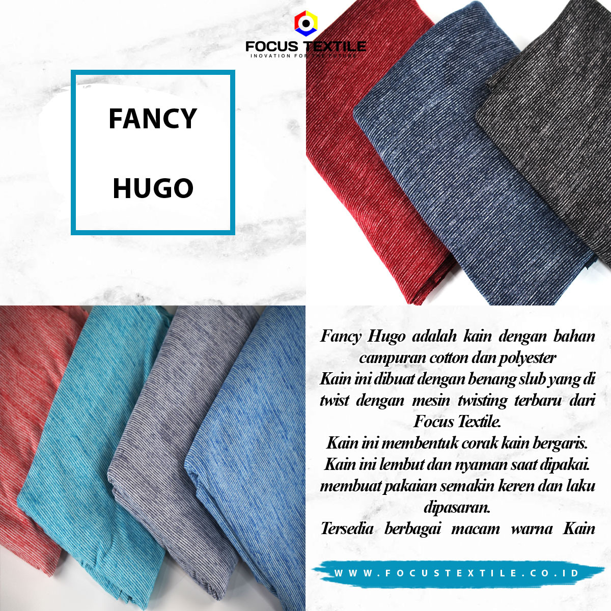 FANCY HUGO ADALAH JENIS KAIN DENGAN BAHAN CAMPURAN ANTARA COTTON DAN POLYESTER. KAIN INI DIBUAT DENGAN BENANG SLUB YANG DI TWIST DENGAN PROSES DAN MESIN TWISTING TERBARU DARI FOCUS TEXTILE.YANG MEMBENTUK CORAK BERGARIS.