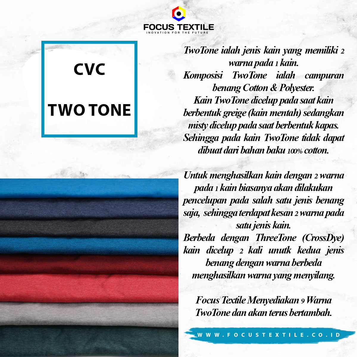 CVC TWOTONE ADLAH JENIS KAIN YANG MEMILIKI 2 WARNA PADA 1 KAIN.
